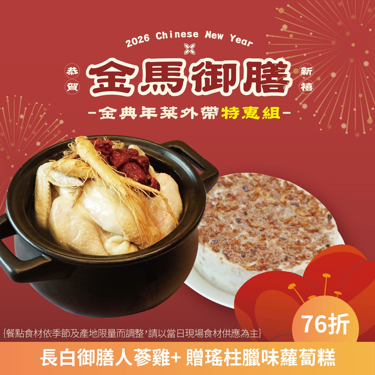 自取年菜特惠組-長白山御膳人蔘雞 贈送:瑤柱臘味蘿蔔糕/個