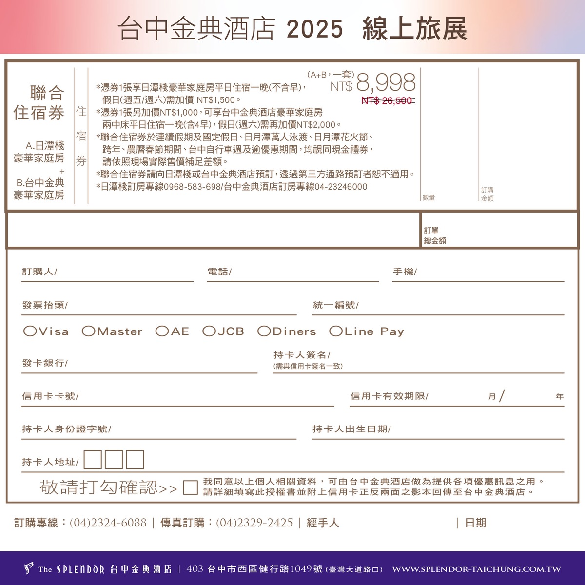 4.聯合住宿券請向日潭棧或台中金典酒店預訂,透過第三方通路預訂者恕不適用。